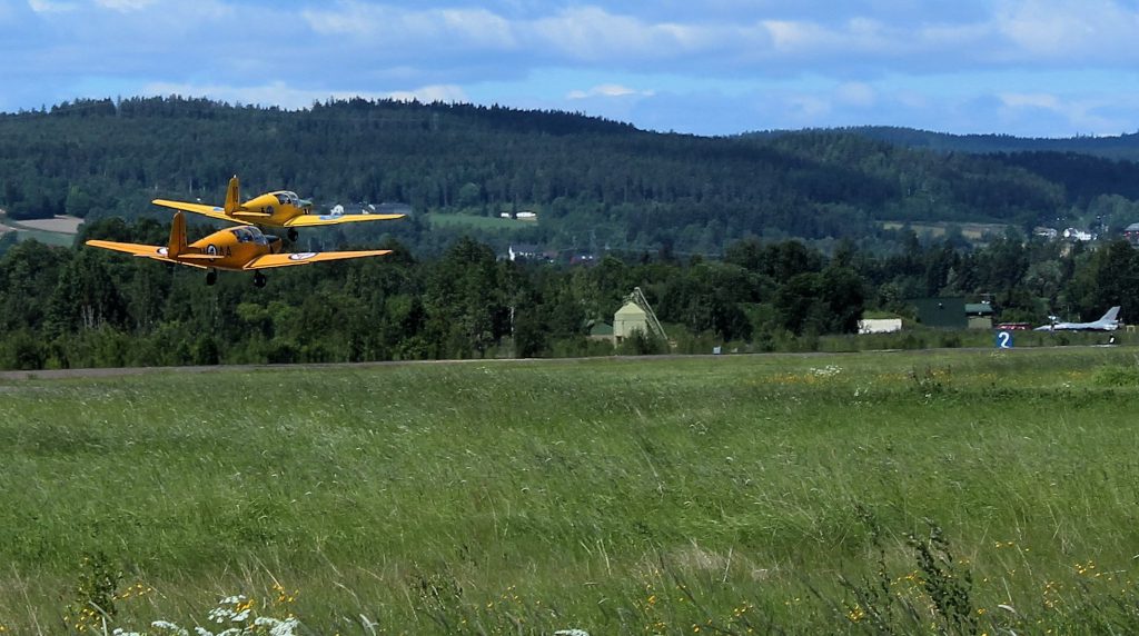 Alignés en 30, on assiste pour notre plus grand plaisir à l’entrainement de deux anciens SAAB jaunes de l’armée de l’air qui décollent cote à cote.