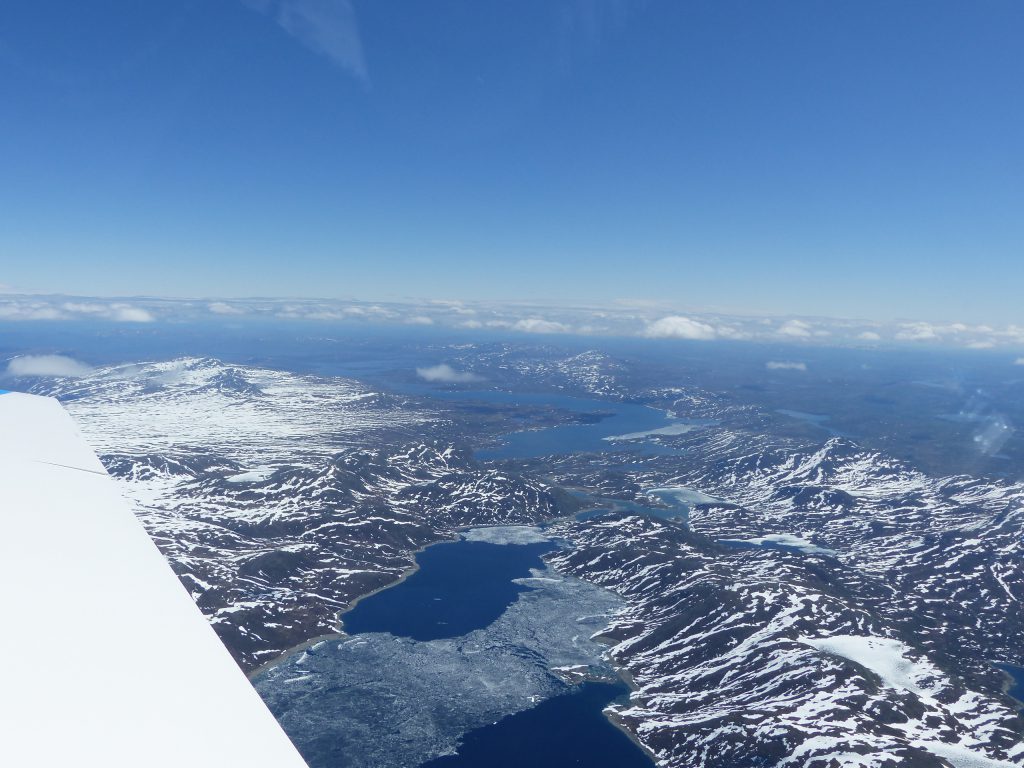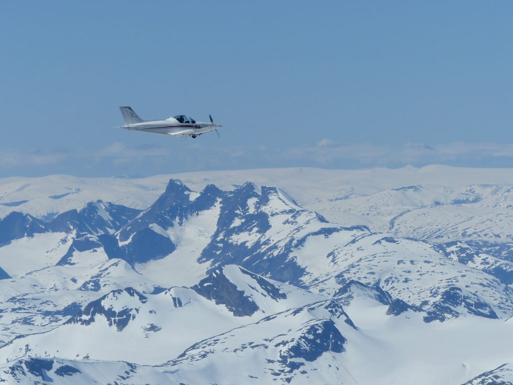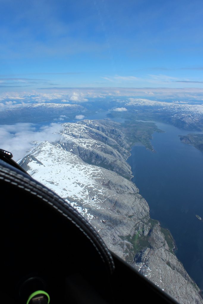 A partir de ce vol nous volerons en formation, et toujours sous plan de vol individuel. Ceux-ci sont ouverts avec Oslo Approche, report de notre position au passage de Nittedal à 2.000ft , les turbulences sont marquées, le vent puissant . Pour contrer les effets nous montons à un niveau FL75 puis demandons le FL105. Le niveau 100 est accordé, mais le contact radar doit préalablement être établi avant d’obtenir l’autorisation du FL105. A cette altitude fini de se battre avec le manche. Le ciel est dégagé, la visibilité à l’infini, le contact visuel avec les autres appareils n’a jamais été aussi facile, le survol des montagnes est époustouflant. Il fait -9° dehors. La neige fait partie intégrante du paysage avec ces sommets à 8000 pieds, le fait de devoir dévier de route du à la météo ne nous a pas seulement rallongé en distance mais aussi fait devoir monter à une plus grande altitude. Après 200km notre trajectoire peut être raccourcie.