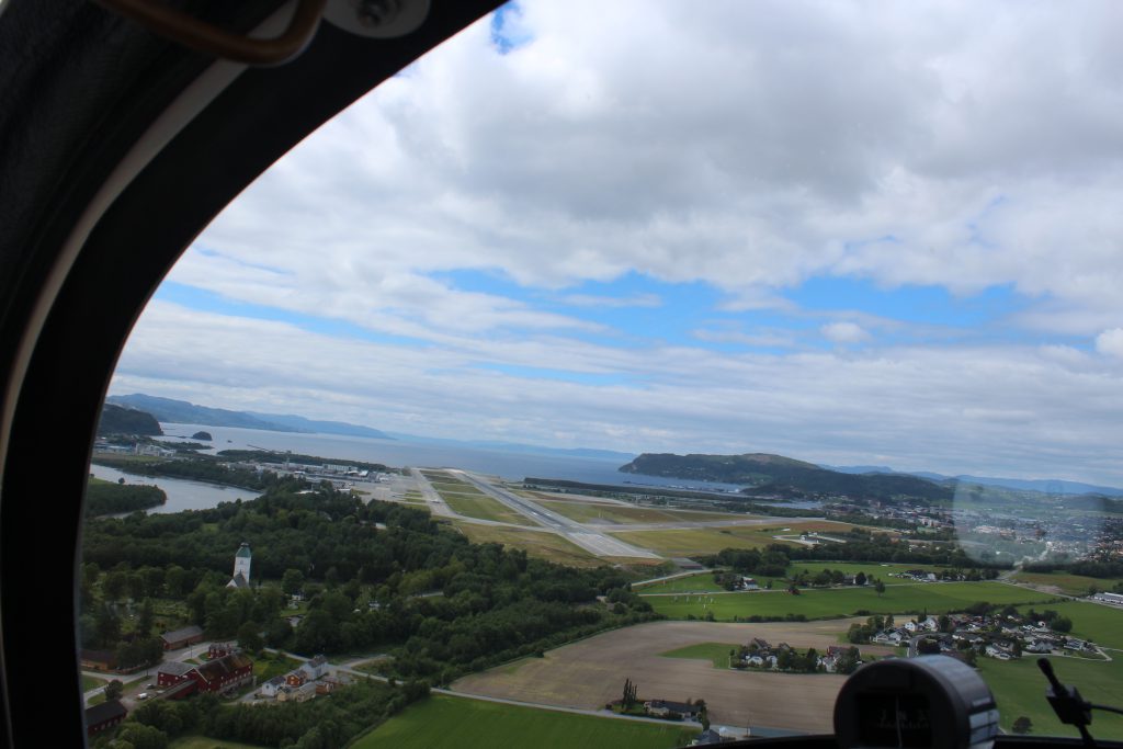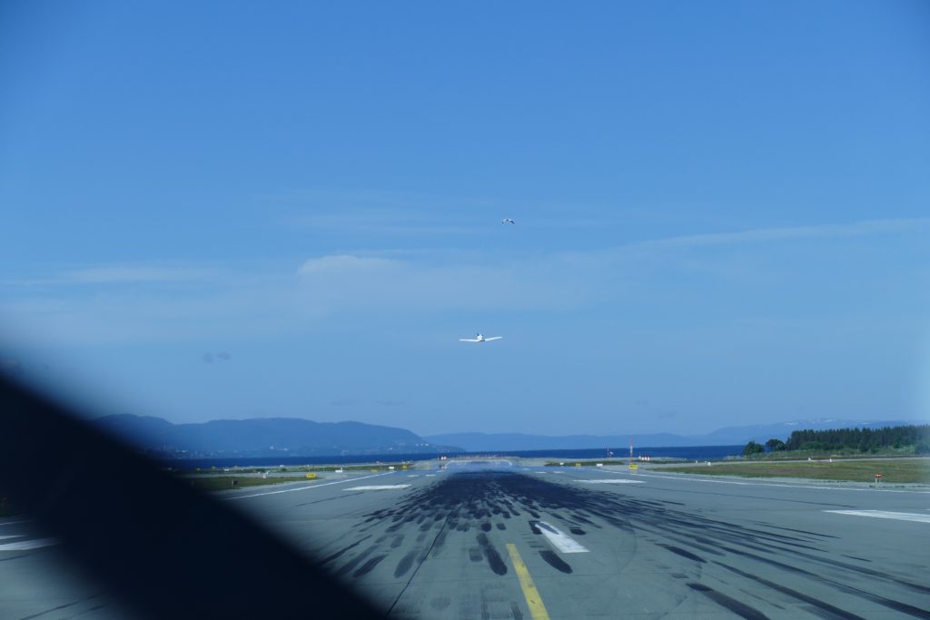 La piste est en vue, la 27, face à la mer en service, le premier Fox en finale, le deuxième prêt à tourner en base doit la rallonger car le contrôleur insert un départ entre les deux ulm. Uli allonge sa finale pour atterrir le plus prêt de la sortie, prendre immédiatement le taxiway pour laisser la place à l’avion de ligne. Les deux ulm suivants se posent talonné à nouveau par un autre avion de ligne. Le trafic est intense à Trondheim. Une navette vient nous récupérer pour nous amener devant un tourniquet de sortie, c’est le moment de descendre…Etonnés parce que nous nous attendions à passer par un guichet et demandons comment procéder pour les taxes. L’agréable conducteur s’enquiert de savoir si nous n’avons pas une weekly landing card. Négatif. Il propose alors d’essayer de nous arranger cela et nous indique par où entrer le lendemain dans l’enceinte de l’aéroport. Petite marche jusqu’au bâtiment principal, prêts à prendre un taxi mais un bus s’arrête, nous grimpons dedans – direction le port. Prise de possession des chambres, balade le long des canaux et des maisons colorées sur pilotis et poisson au dîner sur une terrace chauffée.