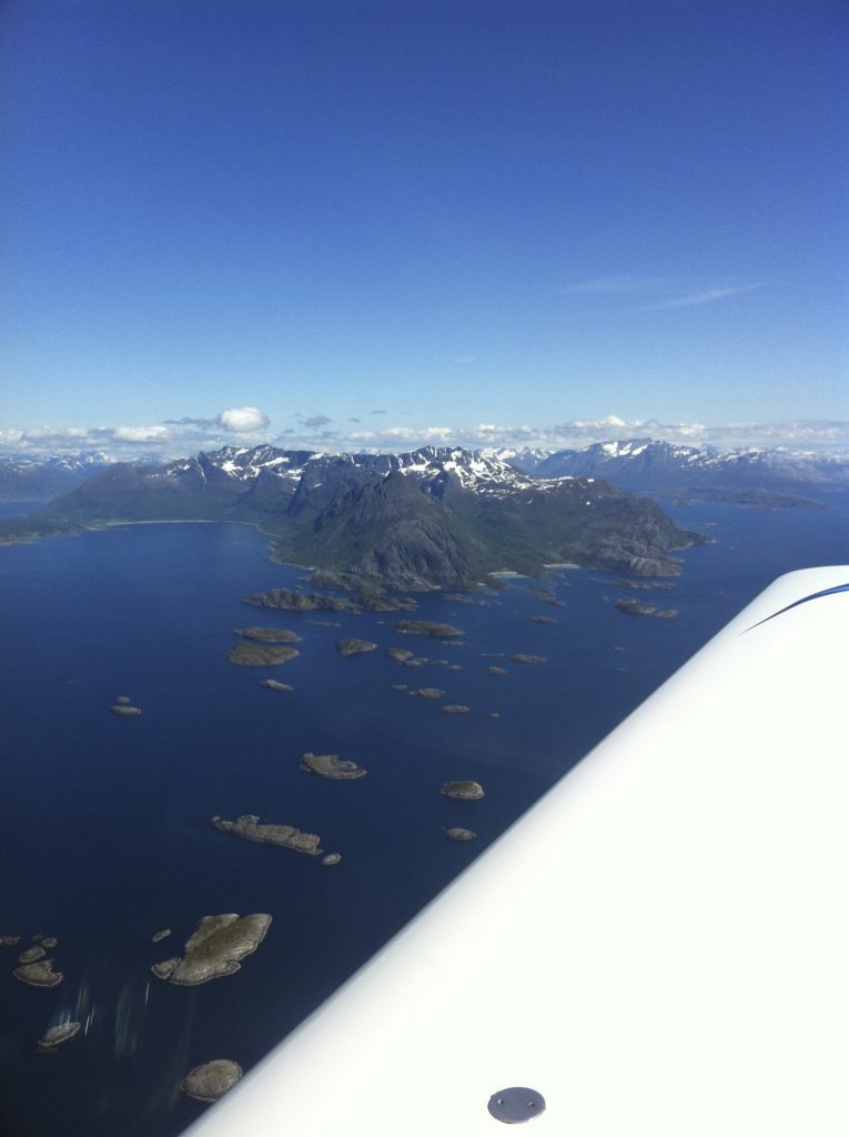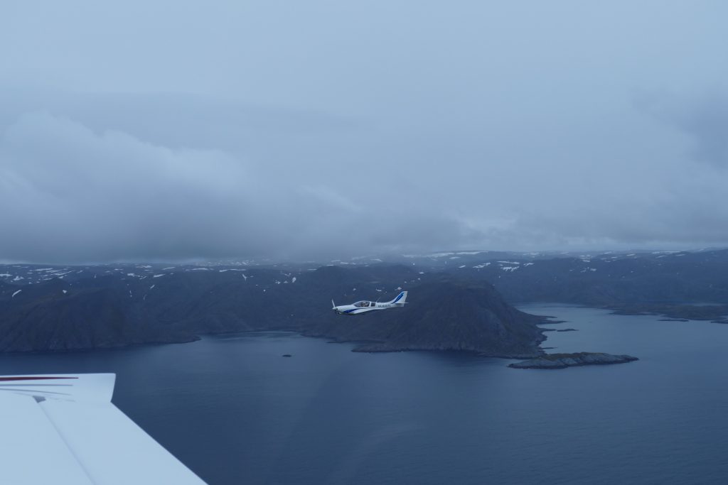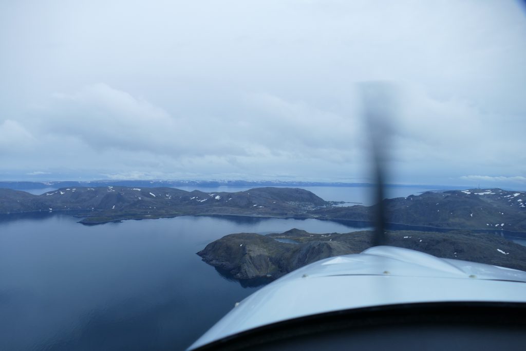 Le grand objectif du voyage, ce jour : le Cap Nord. Malheureusement, le temps change très vite ici et ce n’est pas le soleil de la veille qui nous accueille sur le tarmack mais plutôt une grisaille tristounette. Nos plans de dormir à Menhamn dans un safari camp sont déboutés. Les sommets se cachent déjà dans les nuages. L’envoi email des customs pour le passage de la frontière Norvège – Finlande est fait en même temps que les plans de vols. La météo est médiocre, le plafond bas oscille entre 600ft et 1500ft dépendant des averses mais la visibilité est quand meme de 8km. Nous suivons un couloir au dessus de la mer jusqu’à Tromsø.