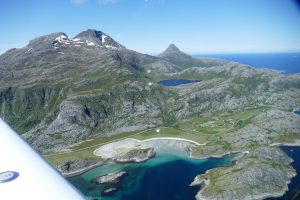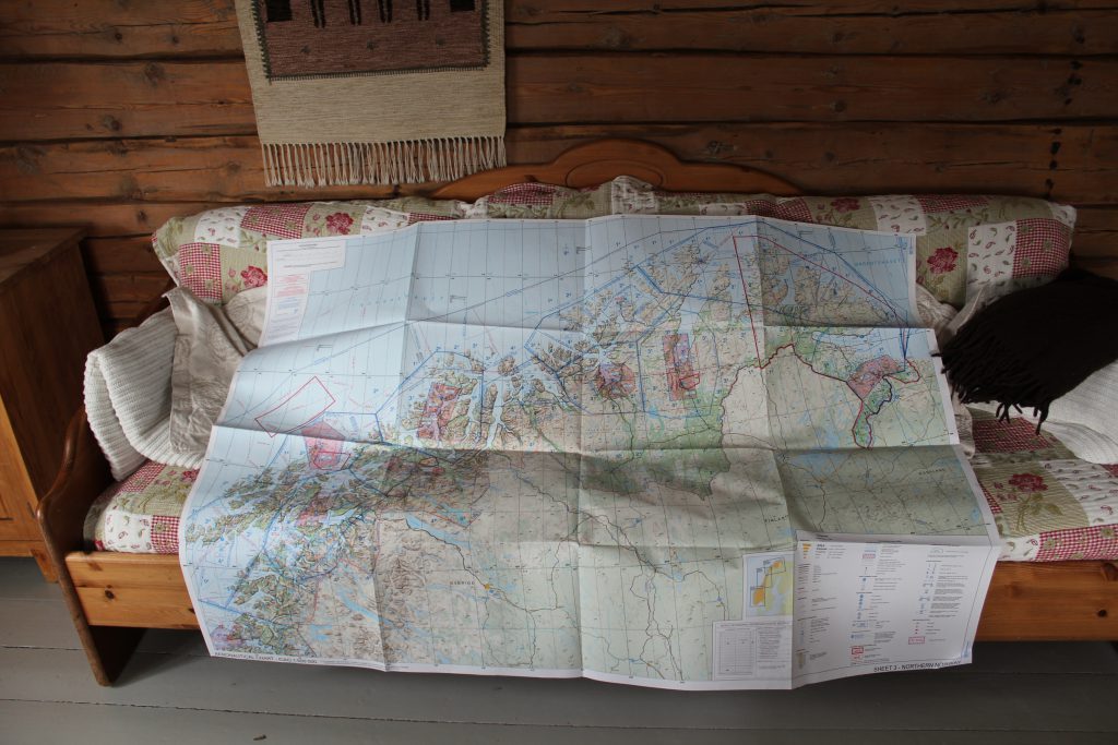 Les Lofoten : nous avons passé le 67eme parallèle, il n’y a désormais ni sunset, ni sunrise. Les ulm sont attachés à des plots de béton si lourds que deux hommes ne sont pas de trop pour les déplacer. Des cartes de publicité de location automobile sont disposées à l’intérieur de l’aéroport, par chance on réussit à commander la dernière mondeo disponible de l’ile. Il fait tellement beau que tout le monde s’est donné le mot pour visiter les Lofoten! En route pour 10km, rejoindre notre maison chez l’habitant, une ancienne ferme en bois rénovée et peinte en blanc jouxtant un bras de mer. On ouvre pour la première fois une des cartes papier gigantesques de la Norvège, *Northern Norway” celle allant des Lofoten au cap, dépliée elle occupe tout l’espace du canapé trois places et on l’étudie en ayant conscience de la facilité actuelle des moyens gps tels que l’ipad. La déplier dans l’ulm doit etre quelque chose!