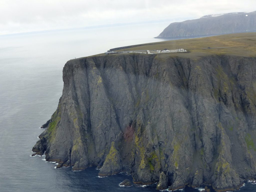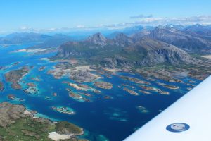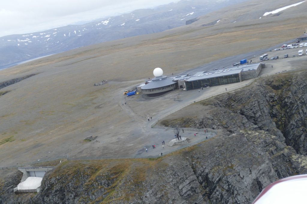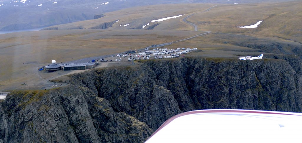 Quelle excitation de survoler le point le plus septentrional d’Europe, d’avoir la chance de voir d’en haut la sculpture du globe devenue le symbole du Cap Nord dont tous les touristes raffolent. Ed ne peut résister à faire un passage à basse altitude. Après s’être régalés de quelques 360°, avoir immortalisés dans nos appareils photo notre passage et ressentit un état de satisfaction intense, nous continuons notre vol jusqu’à Honningsvag. Petit pincement au cœur que de ne pas avoir le temps d’atterrir sur ce petit must des pilotes, cette piste coincée entre les falaises en bordure de mer. Mais il est déjà tard, il y a encore 1h40 de vol jusqu’à Ivalo et avec la météo défavorable et le plan de vol direct, se poser au Cap Nord ne sera pas pour aujourd’hui.