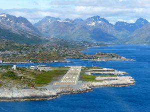 Il est impossible de s’arrêter de photographier ces sommets enneigés plongeants dans l’océan et se prolongeant par de petits ilots de terre; certains vont jusqu’à 5600 pieds. Pour les connaisseurs des Alpes, ce spectacle est totalement différent. Pour atterrir à Bodo, chaque appareil choisit sa trouée pour plonger et les équipages peuvent se régaler de voir le relief de près. Bodø est une simple escale pour faire les pleins, à Svolvaer nous savons qu’il n’y a pas d’Avgas. En vente arrière, la piste est parallèle à la mer qui est, elle même parallèle aux montagnes.