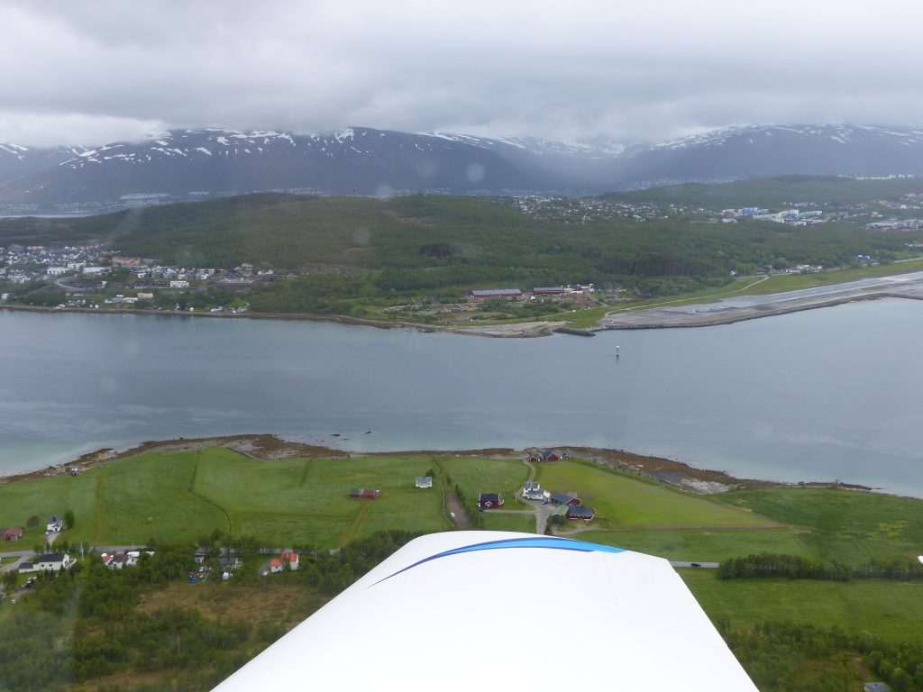 Tromsø n’est qu’un stop pour l’essence ce qui ne nous empêche pas d’apprécier les maisons rouges et bleues à flanc de colline verte dont l’éclat ne laisse pas douter des précipitations abondantes et ses ponts qui la relient au continent et à Kvaloya. Nous nous posons en 19 sous une pluie fine, il fait 4°en sortant du cockpit. Après avoir refueller nous demandons à être guidés au charlie pour évaluer la météo. Il nous faudra 2 heures à observer les satellites et les metar pour décider de continuer.