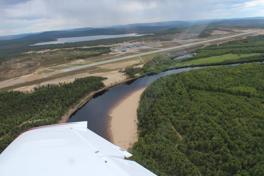 Appel téléphonique par précaution ce matin à Ivalo pour savoir s’il était possible d’atterrir et refueler, leurs heures d’ouvertures étant restreintes. Même si la tour est fermée nous pouvons atterrir en auto-info. A notre arrivée l’aéroport est désert, entouré par un immense grillage. A la porte, un numéro est joignable pour avertir de notre présence mais sans succès. Il faudra patienter une bonne heure avant de voir âme qui vive et gesticuler pour attirer son attention. Ce cher inconnu nous libère en nous donnant le code pour sortir et entrer à convenance de l’enceinte. Appel d’un taxi et direction notre chalet en bois rouge situé paisiblement dans la nature au bord d’une rivière où viennent s’abreuver les élans sauvages. La nuée de moustiques qui nous accueille est en revanche bien moins sympathique. Ivalo est une longue route de plusieurs km, où les maisons et shops un peu démodés et vétustes se succèdent. A minuit, il fait toujours jour c’est déroutant.