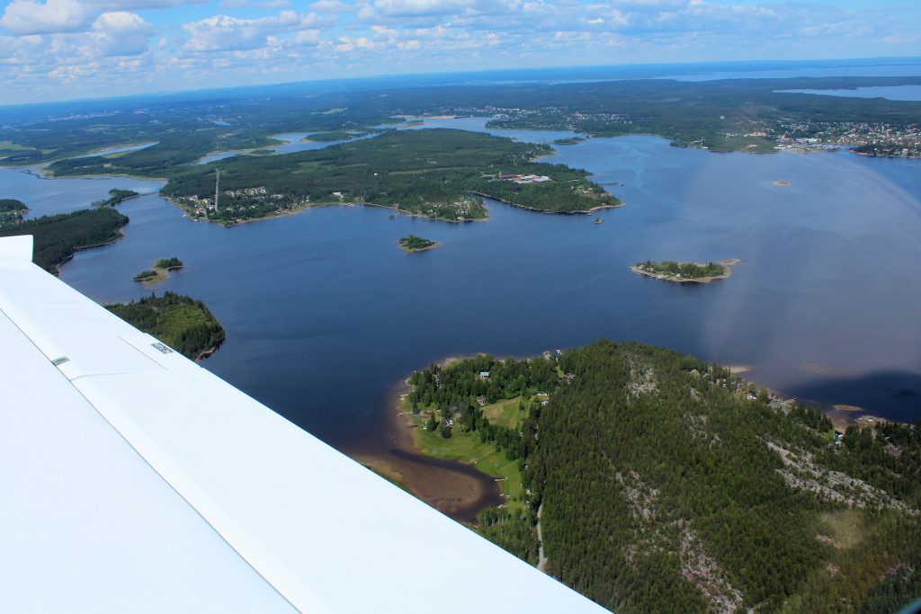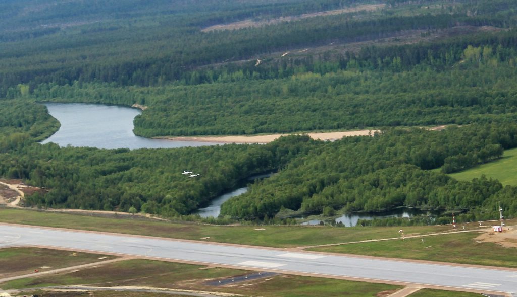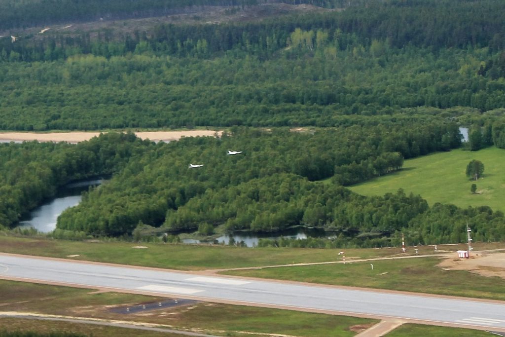 Entrée dans l’enceinte de l’aéroport d’Ivalo grâce au code magique; comme la veille le tarmac est vide. Avons les 2499 m de piste rien que pour nous. Ed et Claude décident de se faire un revival des Saab jaunes de Kjeller et décollent cote à cote. Passons directement sur la fréquence de Tampere mais leur couverture radar ne sera efficace qu’une fois avoir parcouru plus d’une cinquantaine de kilomètres. La frontière est passée à MAGON. Le code transpondeur attribué en Norvège sera conservé au passage en Suède. Nous suivons la cote pour traverser les TMA successives. L’espace contrôlé aérien de Lulea nous contraint à une séparation de 300 pieds entre chaque ulm imposant respectivement 2700ft, 3000ft et 3300ft, relativement difficile à conserver vu les turbulences.