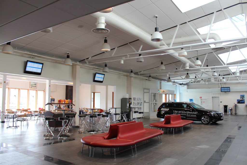 Atterrissage à Skelleftea. Au parking, un avion de ligne SAAB au point mort, des camions et pelleteuses en activité. Les pompistes nous expliquent que les pilotes sont en grève et que si nous souhaitons nous restaurer il conviendrait d’accélérer la cadence. L’aérogare est déserte excepté quelque personnel de sol et un couple d’hollandais désespérant d’attendre leur correspondance. SAAB est la seule compagnie en Suède. On a le sentiment comme à Ivalo d’avoir un aéroport international privé!
