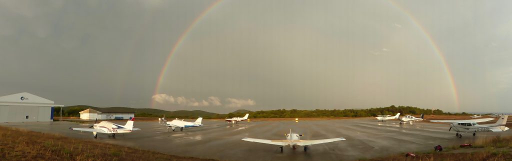 Ici, une dizaine de bateaux proposent les mêmes services Rovinj-le fjord-la plage départ 12.00 et retour en fin d’après-midi, idéal pour une visite d’une journée. Les touristes affluent sur la petite ile de Rovinj, cela devient un art de photographier une ruelle sans passant mais la ville pittoresque, avec son linge séchant aux fenêtres, son marché local, ses maisons du bas de la colline bâties sur la mer, ses restaurants et cafés autour de minuscules cours intérieures vaut la visite. Agréable retour par le fjord Limski jusqu’à un amarrage pour le moins mouvementé : un front a rejoint la baie, l’orage éclate, bien plus tôt qu’attendu. Coincés sur le bateau par l’impossibilité de descendre la passerelle, commencent alors les interrogations sur notre possible retour. L’heure tourne, il pleut à verse mais le vent finit par se calmer et permet de descendre sur la terre ferme pour rejoindre l’aérodrome. Commence alors le guet du ciel en espérant un coin de ciel bleu, le report du plan de vol par téléphone jusqu’à la limite de 19.20, Losinj fermant à 20.00. Roulage au point d’arrêt en faisant fuir les mouettes réfugiées sur le tarmac, backtrack en 18 et décollage en direction du ciel dégagé longeant la côte à 1000 pieds pour un vol d’une demi-heure. Le contrôleur très attentionné de Pula radar informe qu’en raison des mauvaises conditions sur Losinj,  il nous reprendrait sans problème si d’avenant il fallait rebrousser chemin. Survol de Rovinj, encore plus joli d’en haut que d’en bas puis passage à l’ouest de l’amphithéâtre de Pula. Peu avant d’atteindre la destination, des arcs en ciels nous entourent, une pure beauté, la tempête est déjà passée. Au sol, le demi-cercle aux 7 couleurs est complet, une rareté à immortaliser.