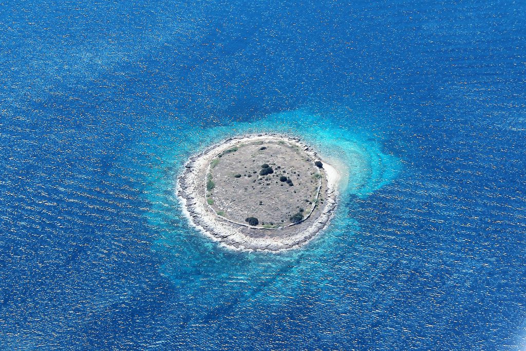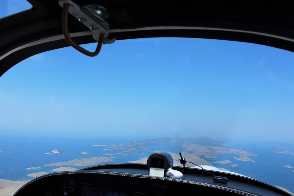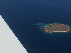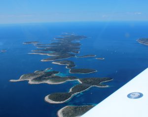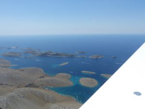 VFR par Adria 1 à 3500 pieds : une myriade d’ilots plus intéressants les uns que les autres de par leurs sols, végétations, formes dont la terre soulevée semble faire des vagues sans oublier les nuances de bleu qui les encerclent. Le plus les iles s’éloignent en mer, le plus leurs terres sont arides.