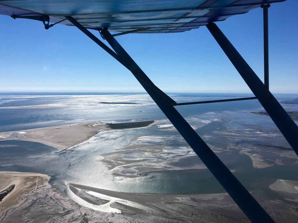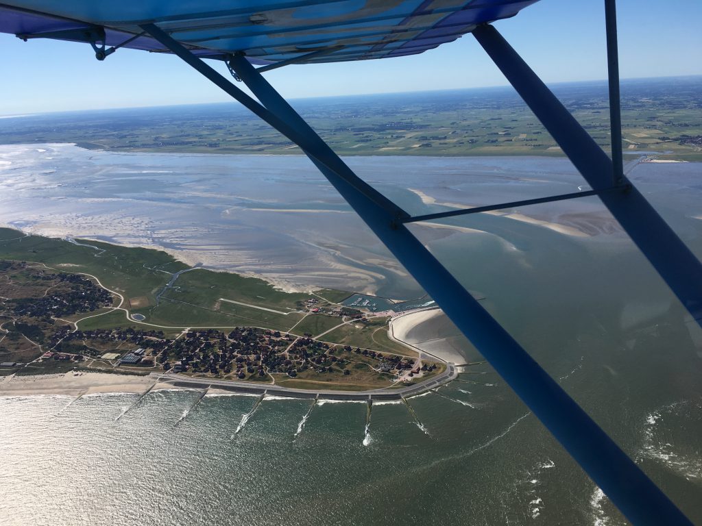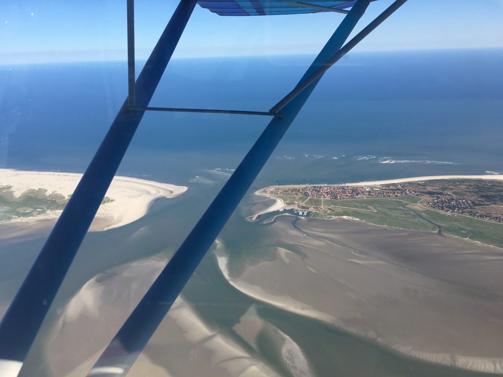 Arrivée à 8h15 au terrain, l’ulm est vite prêt, ne reste que le contrôleur à arriver. En Allemagne il n’est pas permis de décoller ou d’atterrir sans une personne à la tour. Comme il faut compter encore une heure pour atteindre l’estuaire de la baie de Jade, ce sera à 4500ft à 4800 rmp pour arriver aux iles le plus tôt possible, avant que les thermiques ne se mettent en branle et viennent contrecarrer le plan des photos.