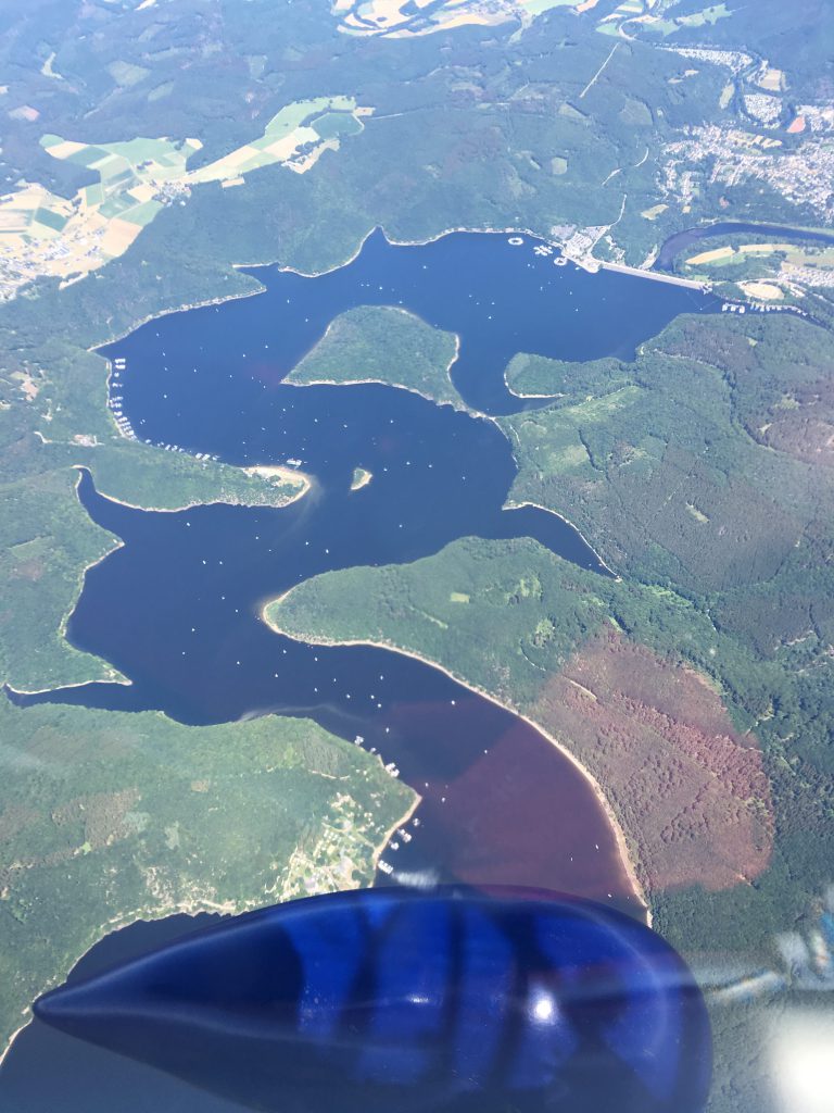 Survol de l’exploitation à ciel ouvert d’une mine de charbon à Eschweiler, du lac de Schwammenauel serpentant, dont la forme peut, avec imagination laisser penser à un dragon et passage de frontière au barrage de Vianden. Le contrôleur luxembourgeois demande le niveau souhaité, à 30 minutes de la destination, proposition d’un 4500 pieds, accordé. Mais alors, quelle idiotie de n’être pas restée plus haut ! Le tour de manège incessant de droite à gauche, d’en haut en bas aurait pu être évité ou tout du moins limité. Atterrissage à Zoufftgen après exactement  2 heures 55 de vol.