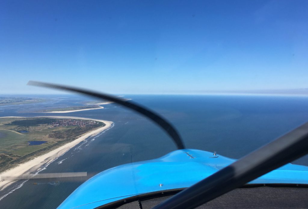 Et…. c’est gagné ! Le ciel est bleu azur, la visibilité : aussi loin que le regard peut porter. En vue de Wangerooge, descente à 2500ft et réduction du régime moteur à 4200. En prime c’est lisse, ça ne bouge pas d’un millimètre !