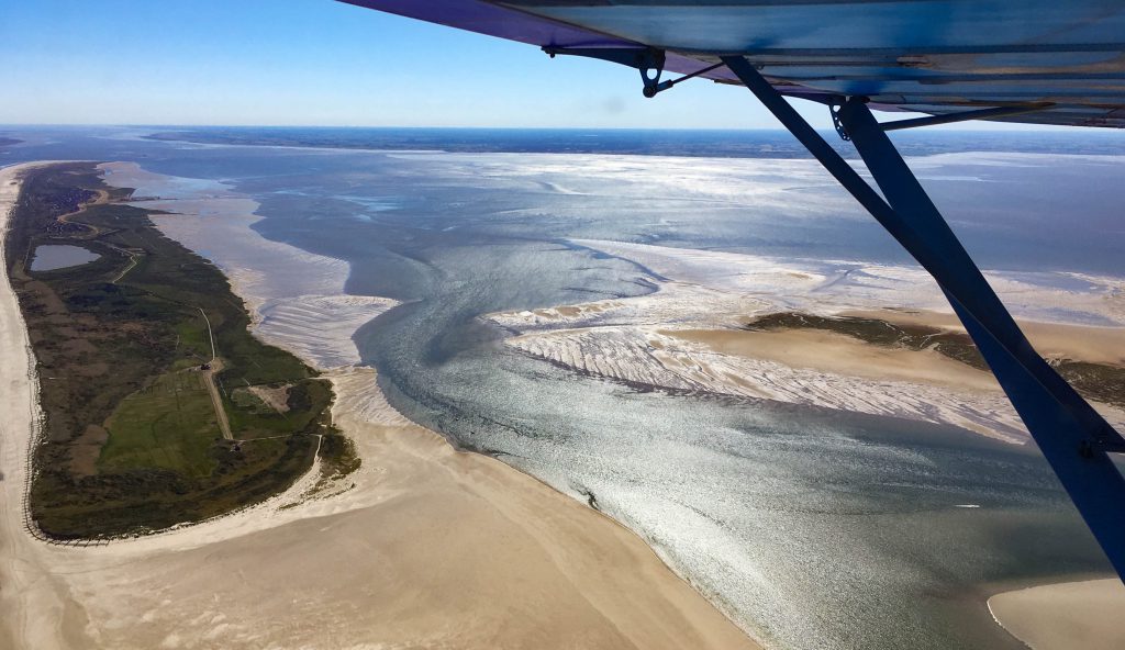 Quel régal de voler dans de telles conditions, de flâner et tourner autour d’une plage pour gagner le meilleur angle de vue, de pencher l’aile du petit bleu pour capturer l’image du soleil luisant sur la mer ou de ce banc de sable aux couleurs pastel, d’avoir à loisir le temps de photographier chaque piste et chaque petit village.