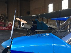 Roulage jusqu’à la pompe essence, avec l’idée de faire le plein qui sera vite abandonnée. Le vent souffle tellement qu’il serait impossible de ne pas avoir des projections sur le plexiglas. Crainte de laisser seul le petit bleu dans un tel vent. Demande à la tour si un hangar ne serait pas disponible. Négatif. Envoyée au parking. Moteur coupé, brakefreins enclenchés, prête à sortir de l’ulm pour l’attacher, la voiture” follow me” déboule. Un jeune gars annonce avec sourire qu’il y a une place disponible dans un hangar, il n’y a qu’à le suivre! Le hangar est derrière les installations nouvelles, le propriétaire de la place est parti pour tout le weekend end en Suède ou Norvège, une réelle aubaine apparemment c’est généralement quasi impossible d’obtenir un hangar.